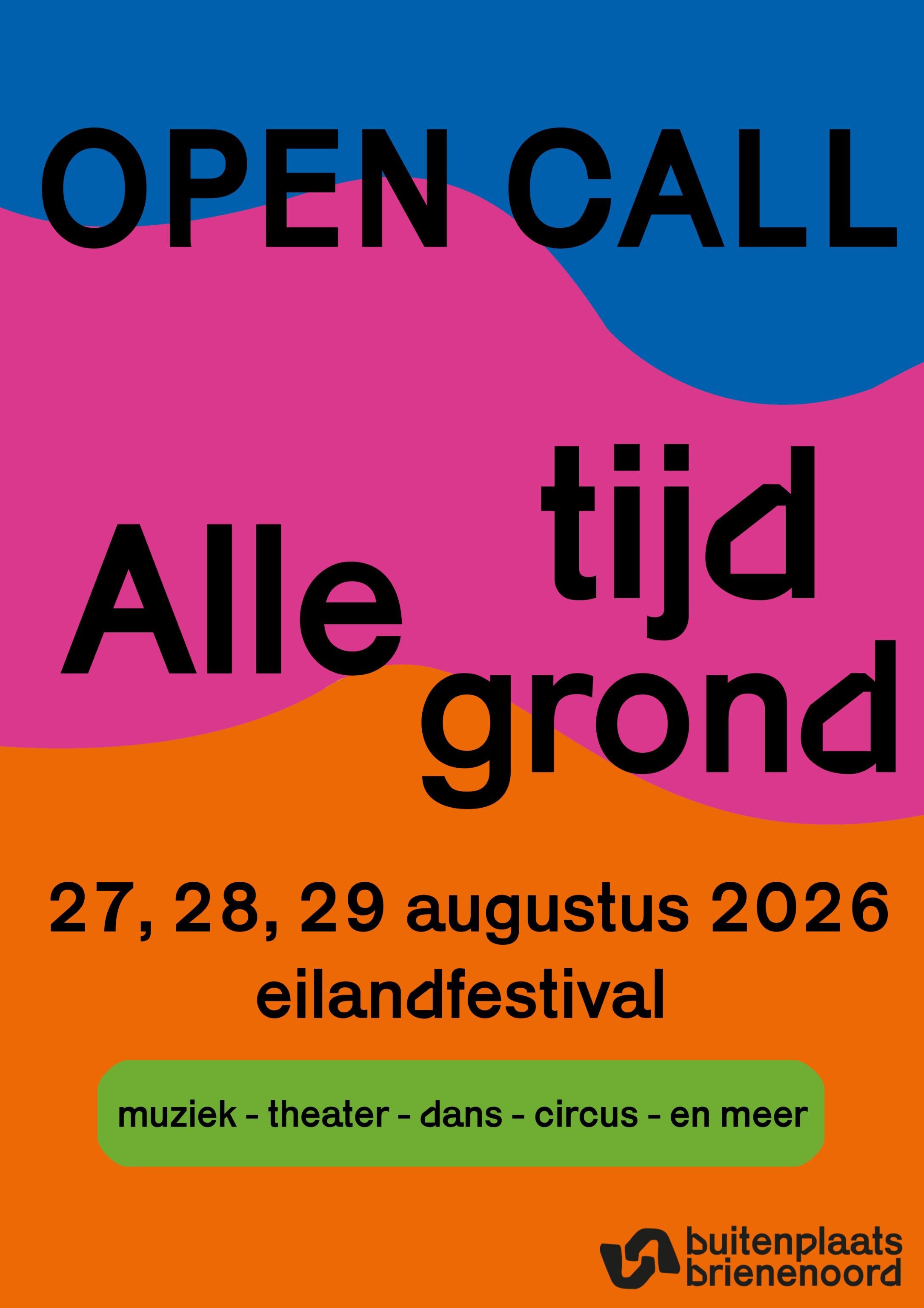 ALLE TIJD - ALLE … is een interdisciplinair podiumkunstenfestival op het Eiland van Brienenoord in Rotterdam. Aan het eind van de zomer verandert het eiland in een tijdelijk landschap van performances, installaties, muziek en rituelen, waar we nog van de laatste zonnestralen kunnen genieten. Nèt voor dat het gewone leven weer begint.