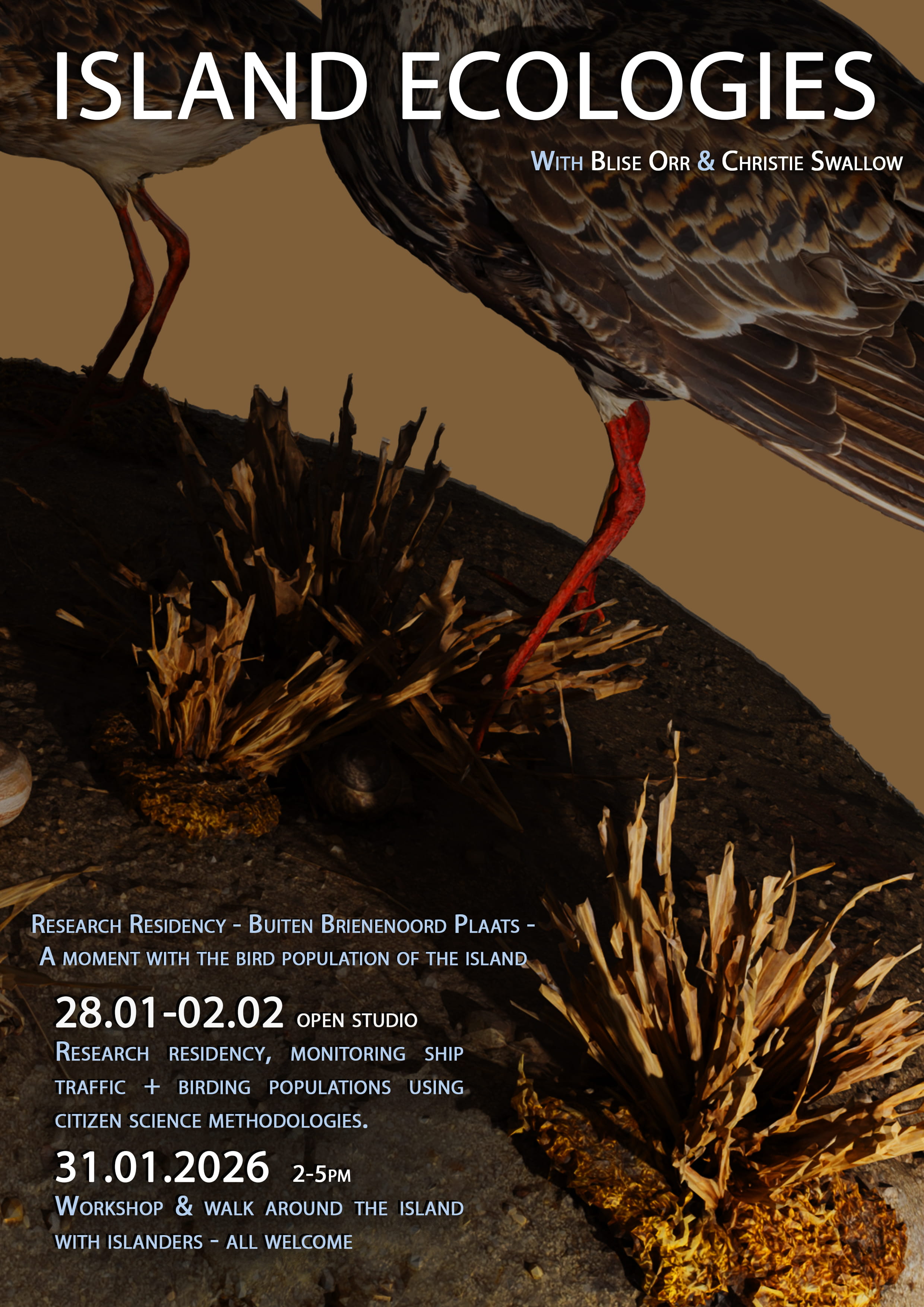 During their Research Residency, Blise Orr and Christie Swallow will research the islands’ birdlife. Over an initial 4 day residency period they will work through print, drawing, sample and collection to develop a body of research. They will further investigate shipping traffic, relating the port city to the island and looking at the nautical links these birds may have with passing ships. Centuries of shipping people, matter and more than human kin across the world can be read into bird populations thriving in the port towns of Rotterdam, London, Lisbon, etc.